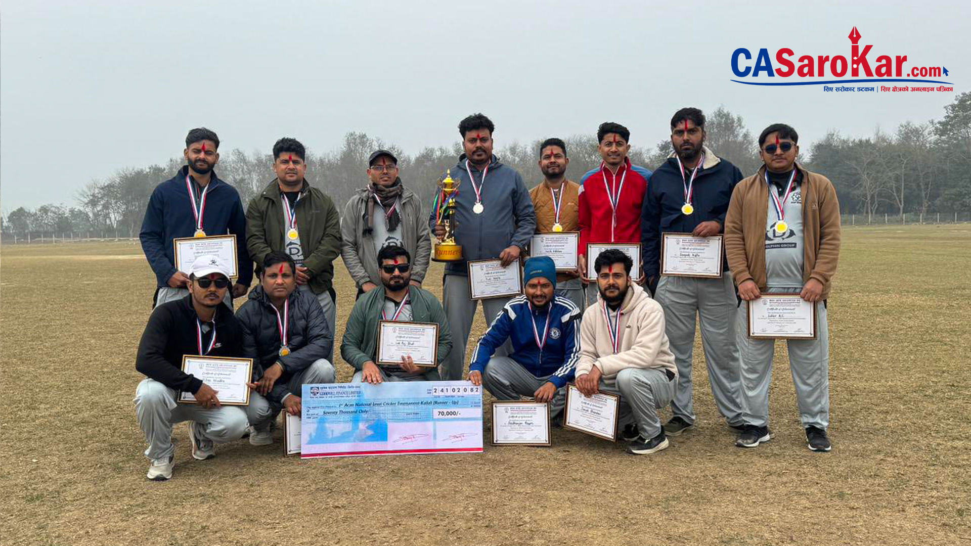 काठमाडौँ। नेपाल चार्टर्ड एकाउन्टेन्ट्स संघ (एक्यान) ले राष्ट्रिय स्तरको क्रिकेट प्रतियोगिता सफलतापूर्वक सम्पन्न गरेको छ। एक्यान कैलाली च्याप्टरले माघ २२, २३ र २४ गते धनगढीमा पहिलो एक्यान राष्ट्रिय स्तरको क्रिकेट प्रतियोगिता सफलतापूर्वक सम्पन्न गरेको हो ।