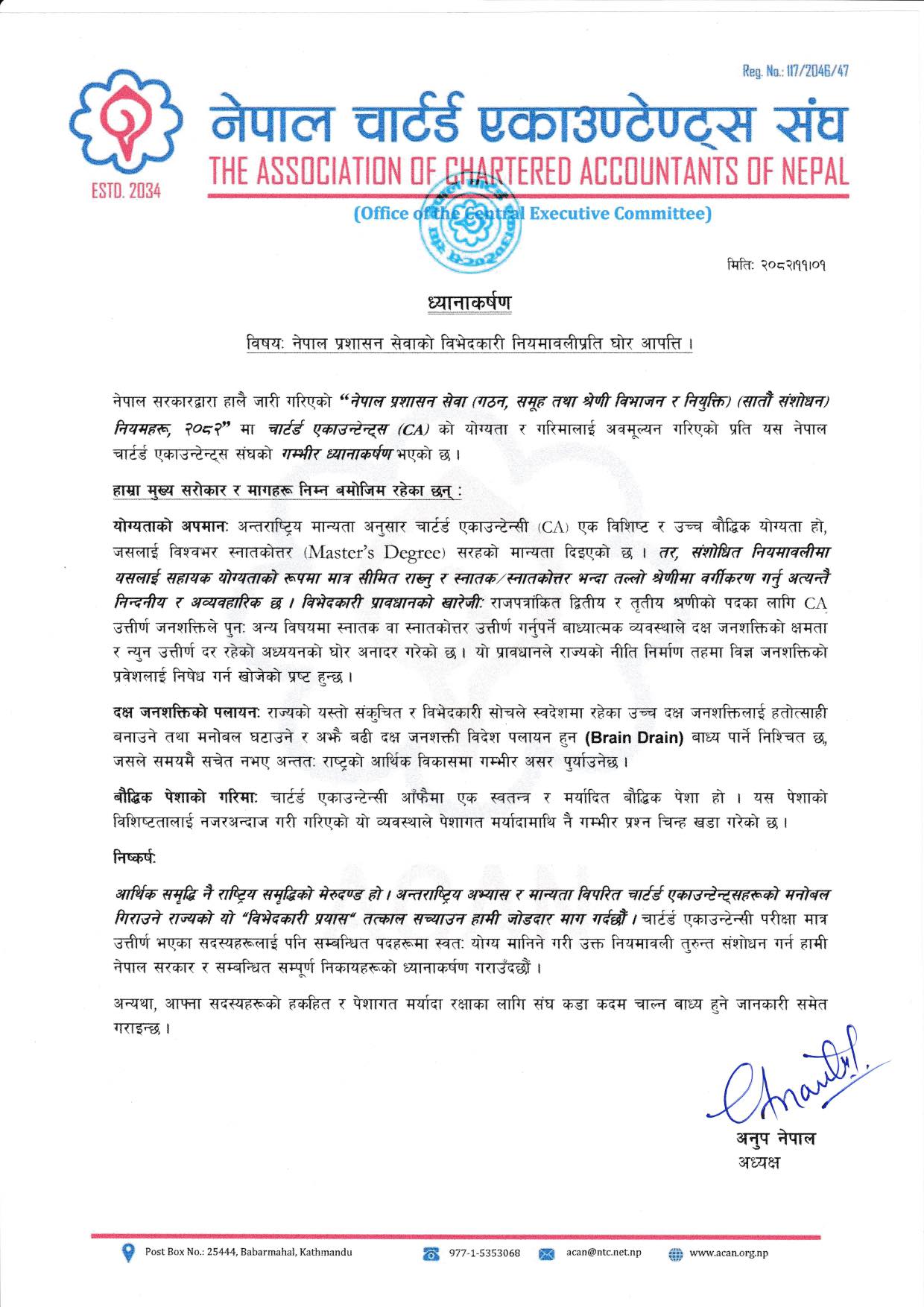 एक्यानले जारी गरेको सूचनामा भनिएको छ, ‘नेपाल सरकारद्वारा जारी गरिएको ‘नेपाल प्रशासन सेवा (गठन, समूह तथा श्रेणी विभाजन र नियुक्ति) (सातौँ संशोधन) नियमहरू, २०८२’ मा चार्टर्ड एकाउन्टेन्ट (CA) को योग्यता र गरिमालाई अवमूल्यन गरेकोप्रति नेपाल चार्टर्ड एकाउन्टेन्ट्स संघको गम्भीर ध्यानाकर्षण भएको छ।’ यस्तो छ एक्यानले जारी गरेको सूचना: