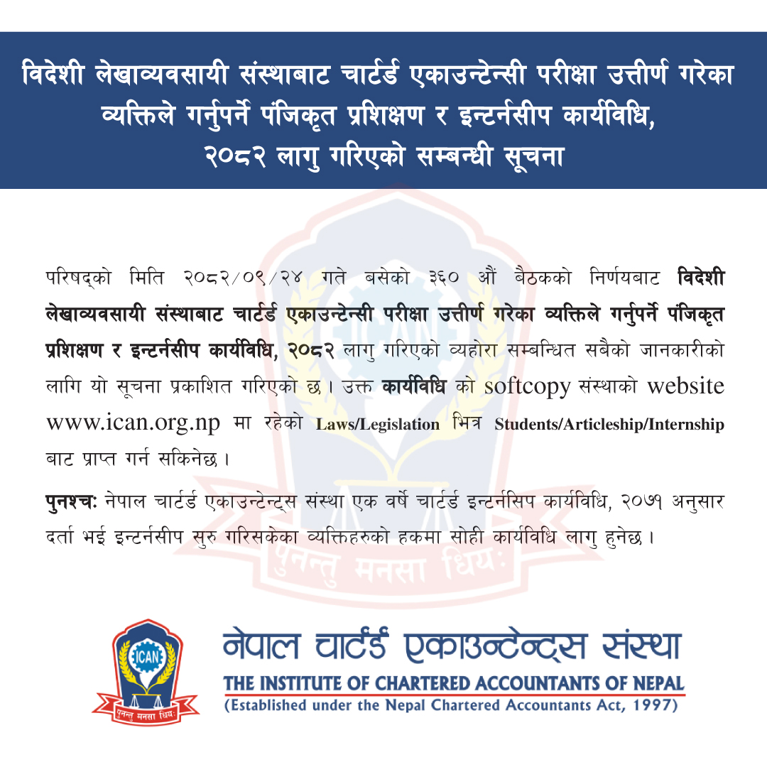 आइक्यानले पुस २४ गते बसेको ३६०औँ बैठकको निर्णयअनुसार विदेशी लेखाव्यवसायी संस्थाबाट चार्टर्ड एकाउन्टेन्सी (सिए) परीक्षा उत्तीर्ण गरेका व्यक्तिहरूका लागि ‘दर्ता प्रशिक्षण तथा इन्टर्नसिप कार्यविधि, २०८२’ लागू गरेको हो।
