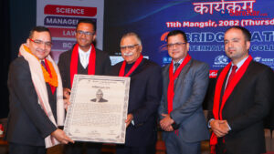 काठमाडौँ। सिए मनोज ज्ञवाली सम्मानित भएका छन्। बैंक तथा वित्तीय क्षेत्रमा ठुलो योगदान पुर्याएको भन्दै सिए मनोज ज्ञवाली ब्रिजवाटर इन्टरनेशनल कलेजको अभिनन्दन तथा विद्यार्थी स्वागत-बिदाई कार्यक्रममा सम्मानित भएका हुन्। काठमाडौँको सिनामंगलस्थित ब्रिजवाटर कलेजको उक्त कार्यक्रम मङ्सिर ११ गते बिहीबार प्रज्ञा भवन, कमलादीमा नबिल बैंकका सिइओ मनोज ज्ञवालीलाई पनि अभिनन्दन गरिएको थियो । ब्रिजवाटर कलेजले हरेकContinue reading "बैंकिङ क्षेत्रमा ठुलो योगदान पुर्याएको भन्दै सिए मनोज ज्ञवाली सम्मानित"